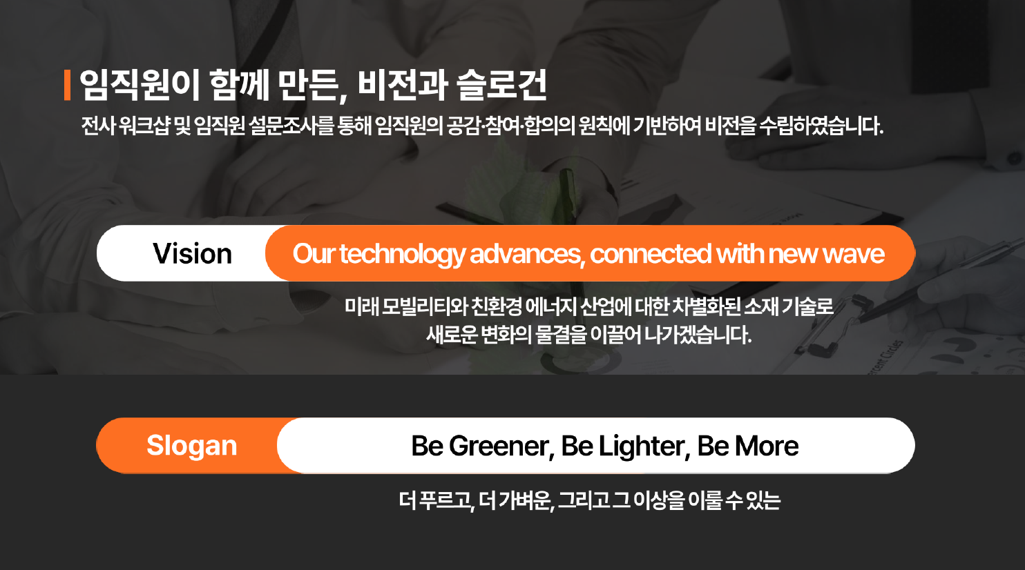 미래 모빌리티와 친환경 에너지 산업에 대한 차별화된 소재 기술로 새로운 변화의 물결을 이끌어 나가겠습니다.